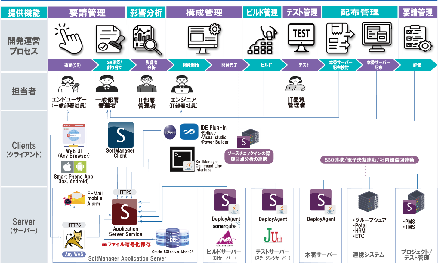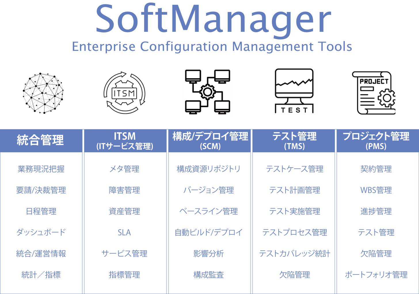SoftManagerは、IT開発・運用の全プロセスをひとつの統合基盤で管理するAll-in-Oneプラットフォームです。