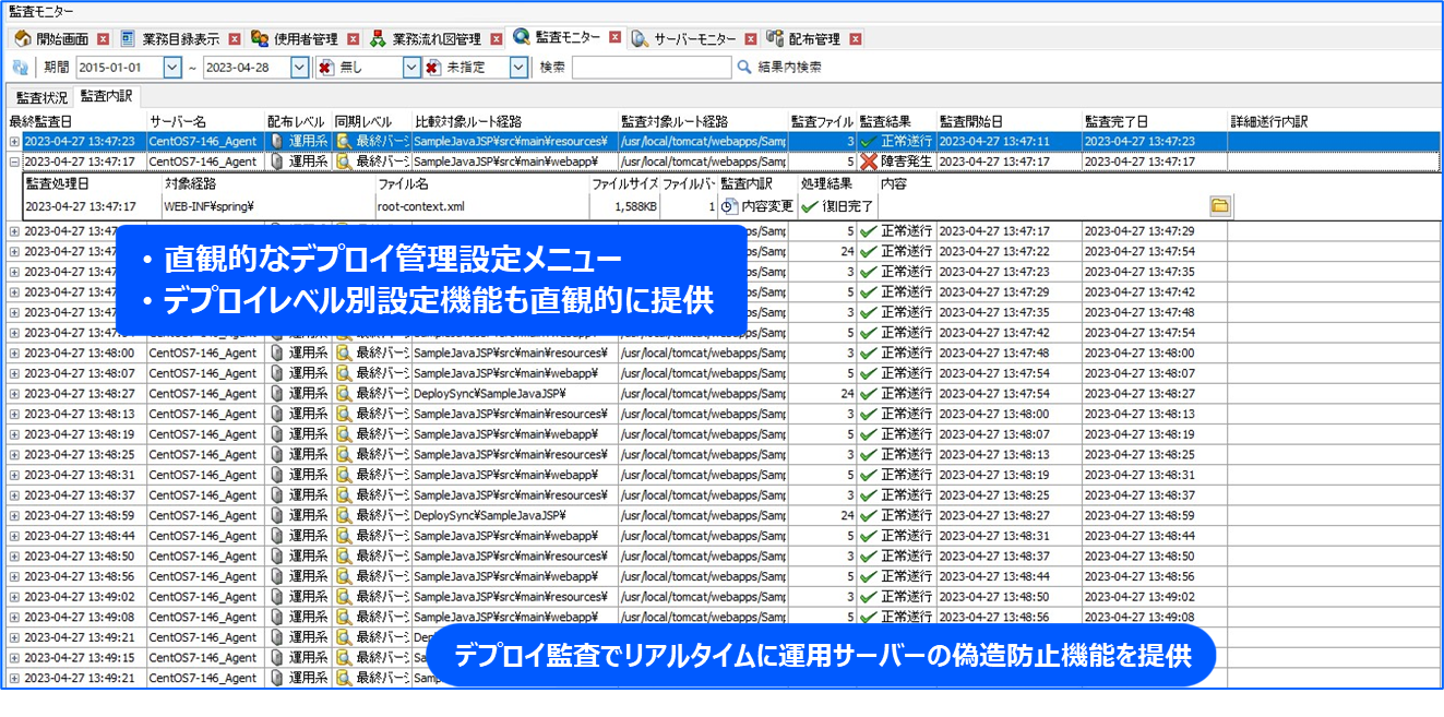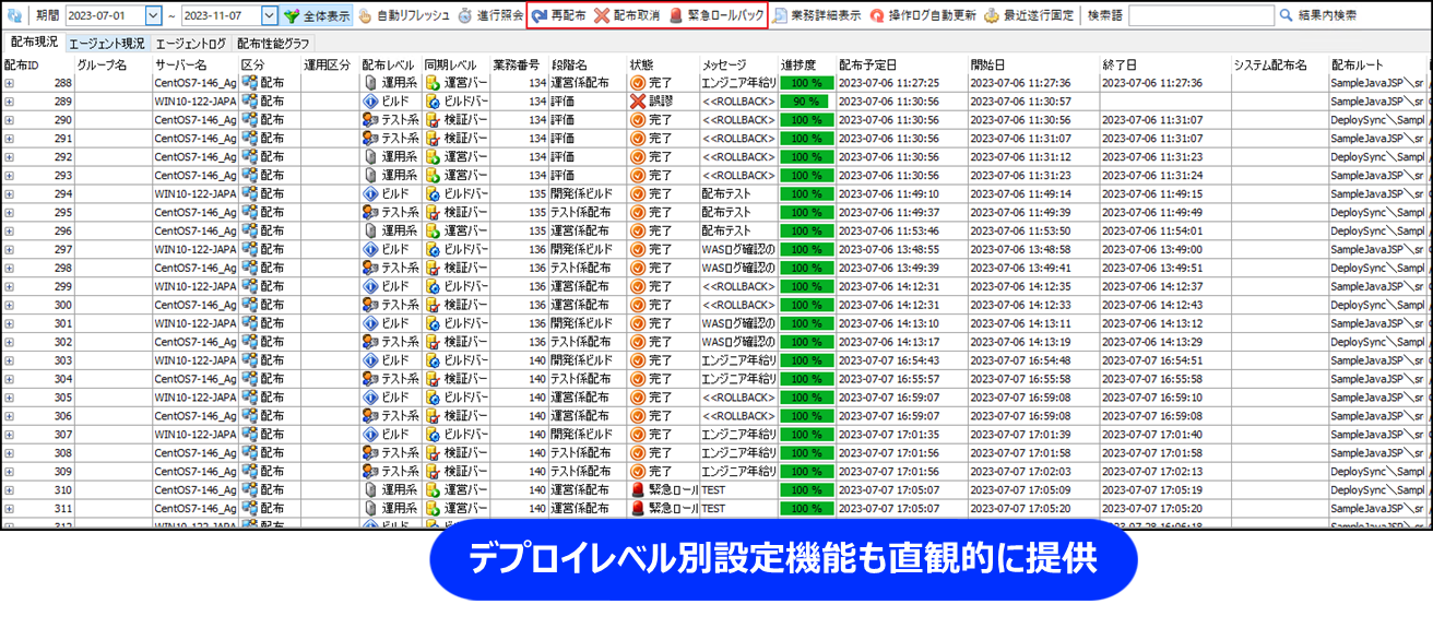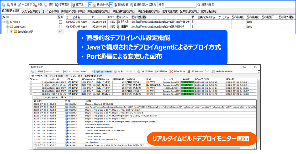 | ✅ デプロイ管理 | 承認済バージョンの自動配布/WASアプリの自動再起動/ロールバック対応 |